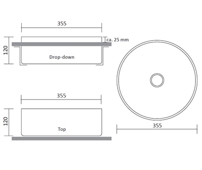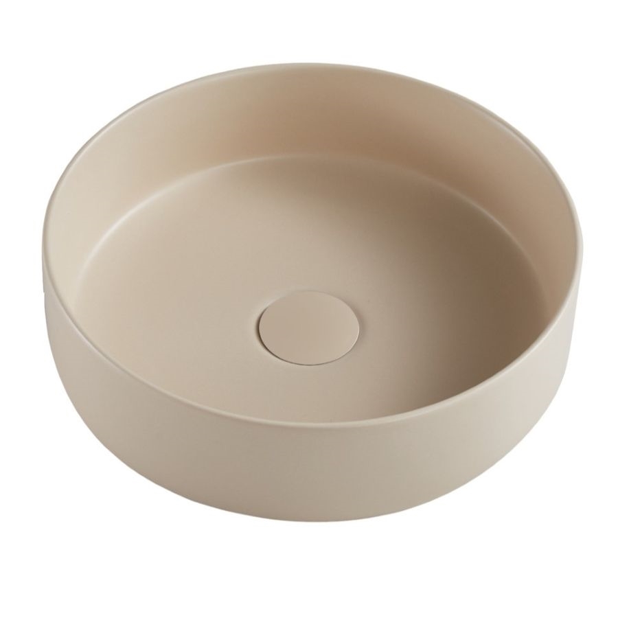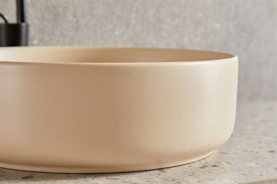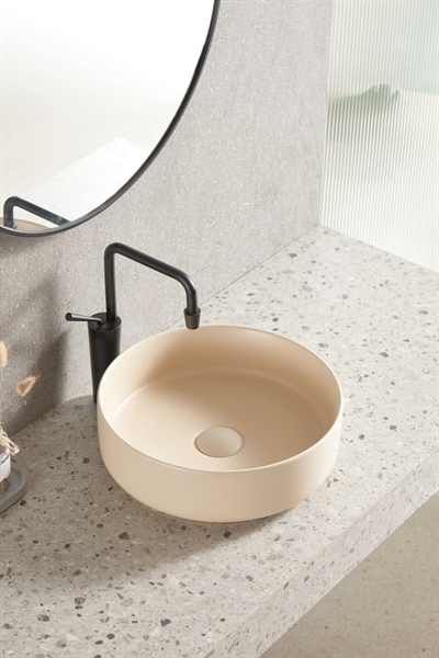 Riktig flott rund porselensvask som både kan monteres direkte oppå benkeplaten (toppmontering) eller felles ned i benkeplaten (drop-down montering). Finnes i flere flotte farger. Porselen er et keramisk produkt av kaolin, kvarts og feltspat. Formet, tørket og deretter brent ved 900–1600 °C.