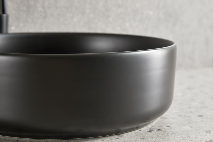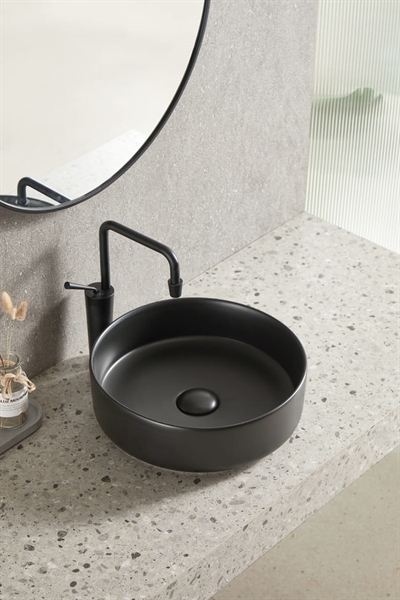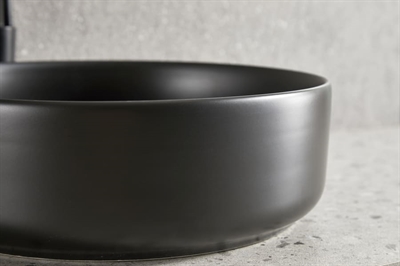 Riktig flott rund porselensvask som både kan monteres direkte oppå benkeplaten (toppmontering) eller felles ned i benkeplaten (drop-down montering). Finnes i flere flotte farger. Porselen er et keramisk produkt av kaolin, kvarts og feltspat. Formet, tørket og deretter brent ved 900–1600 °C.