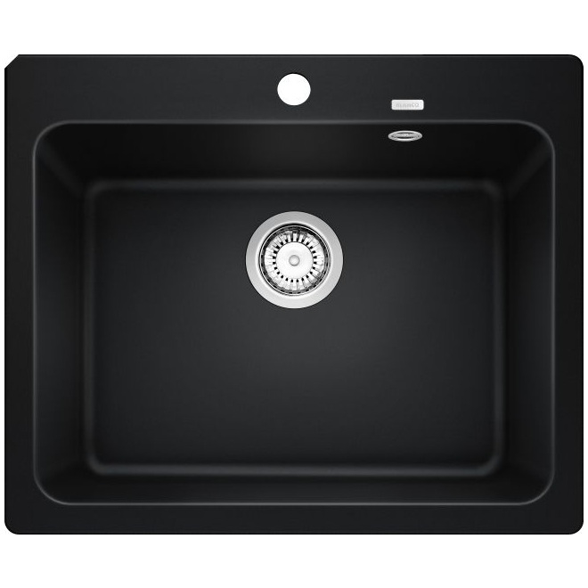 Kjøkkenvask i silgranitt med stor og dyp kum og smalt bakpanel. Bakpanelet har forborede hull, som lett kan slås ut til f.eks. såpedispenser eller liknende.