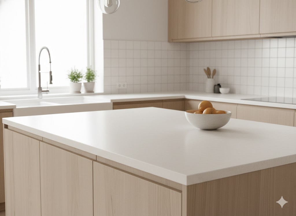 Cameo White Corian®benkeplate er en av de veldig populære corian benkeplatene. En Cameo White Corian benkeplate er en lekker kremhvit benkeplate med en varm og lett gyllen undertone. Fargen er vakker, og komplemeterer godt corian®materialets silkemyke finish. De hvite nyansene i Corian er generelt veldig populære som benkelplater, da hyppig bruk og slitasje nesten ikke er synlig på de lyse ensartede overflatene. En Cameo White Corian benkeplate passer også perfekt på baderommet, hvor den blant annet matcher veldig godt til interiør av tre.