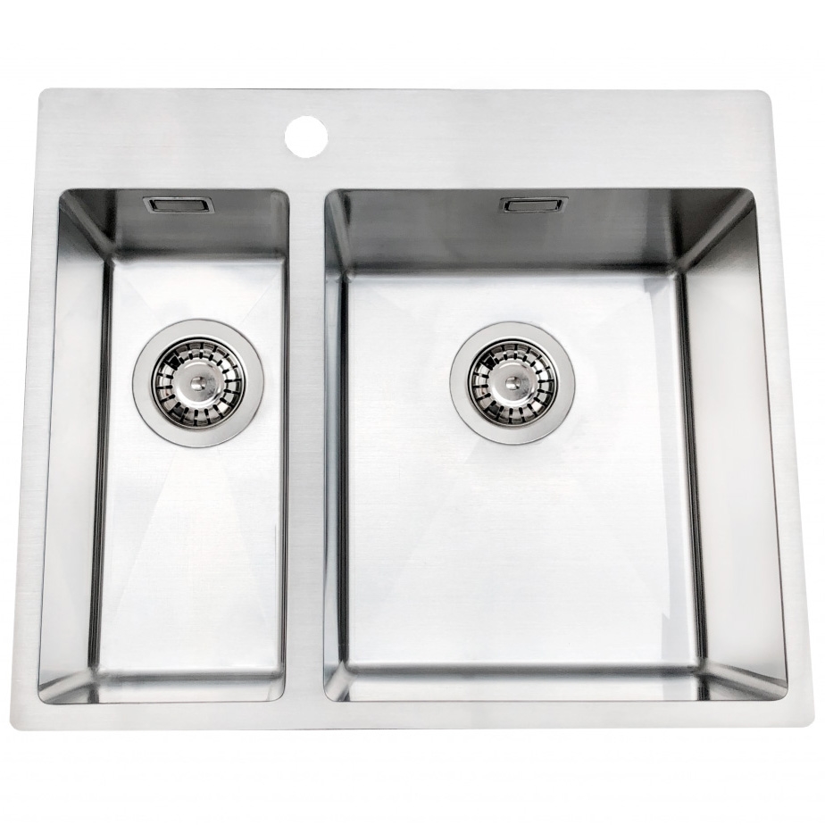 Kombinert skyllevask og vanlig vask. Vasken har avrundede hjørner som gjør rengjøringen enkel.