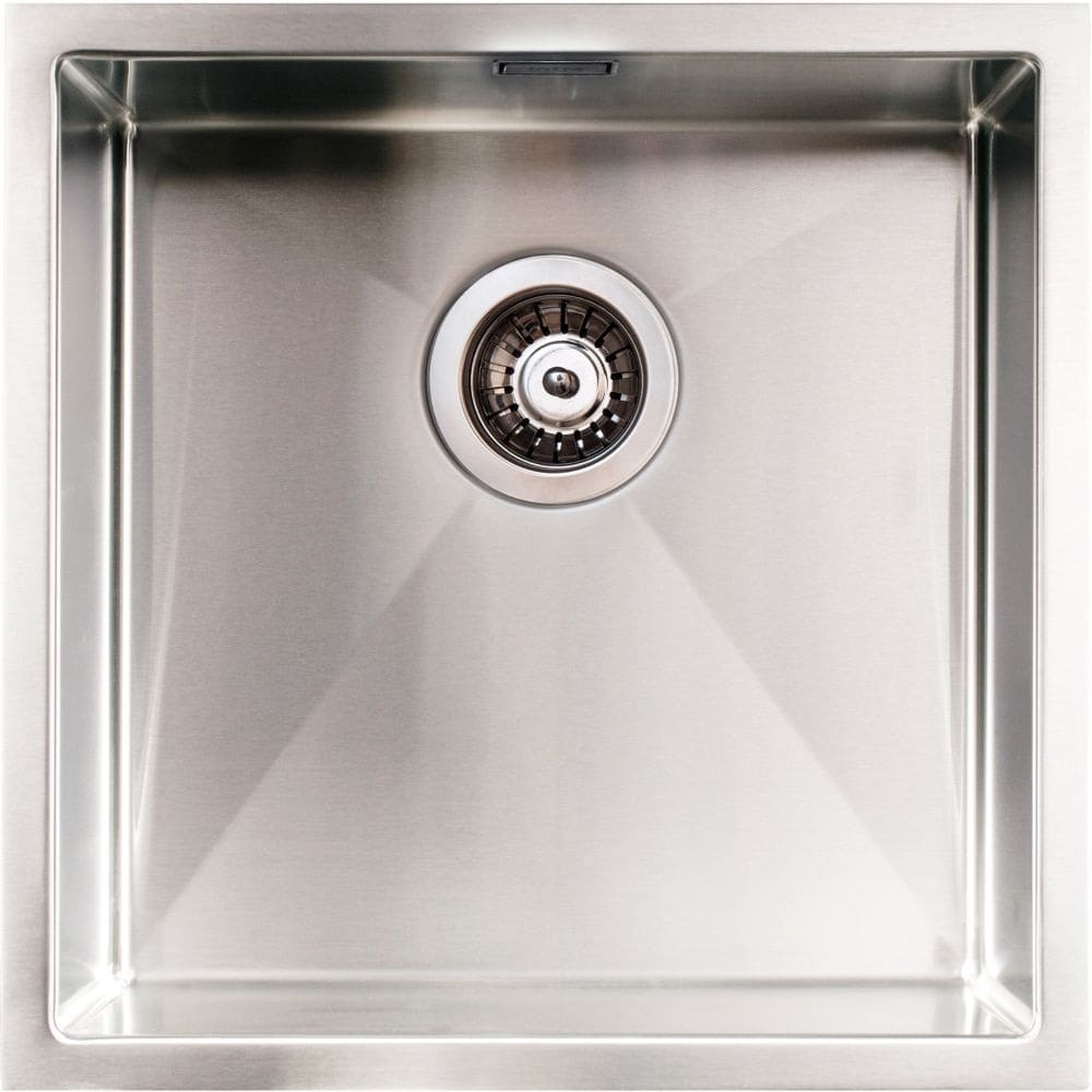 Moderne rustfri stålvask med kuvertbunn som effektivt leder vannet til avløpet.