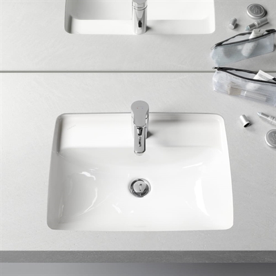 Flott og enkel firkantet porselensvask med plass til vannkran til badet. Porselen er et keramisk produkt av kaolin, kvarts og feltspat. Formet, tørket og deretter brent ved 900–1600 °C. Porselensvasker er ikke 100 % plane i overflaten. Ved underlimte porselensvasker vil benkeplaten gå ut over vaskekanten, og overhenget kan variere på grunn av toleransene på vaskene. Det kan forekomme en synlig kant innenfor toleransene på 5–10 mm.