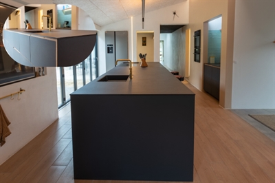3366 Luna sort stein-look kompaktlaminat benkeplate med sort kjerne er en flott, sort kompaktlaminat benkeplate, som ligner steinmateriale til forveksling. 3366 Luna med sort kjerne har en fin overflatestruktur med "åreavtegninger" akkurat som ekte naturstein, og benkeplaten er på én gang både elegant og rå i sitt uttrykk og er en virkelig populær kompaktlaminat kjøkkenbenkeplate. Luna 3366 kompaktlaminat har dessuten en sort kjerne, som gjør det massive stein-look enda mere overbevisende. 3366 Luna sort stein-look kompaktlaminat med sort kjerne fås i tykkelsen 12 mm.