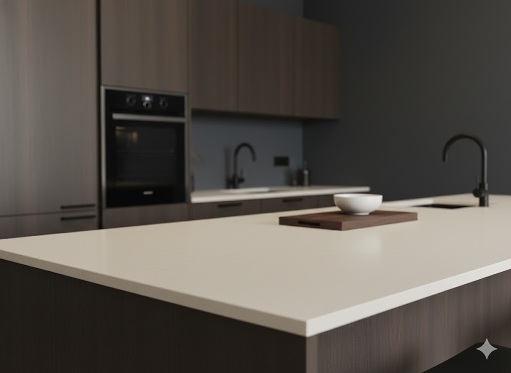 30 - 40 mm er bygget opp av 12 mm Corian pålimt en kjerne av sponplate. Skjøter og vasker i Corian kan sammenlimes, så overgangen faktisk ikke kan ses - benkeplaten kan fremstå som en hel enhet